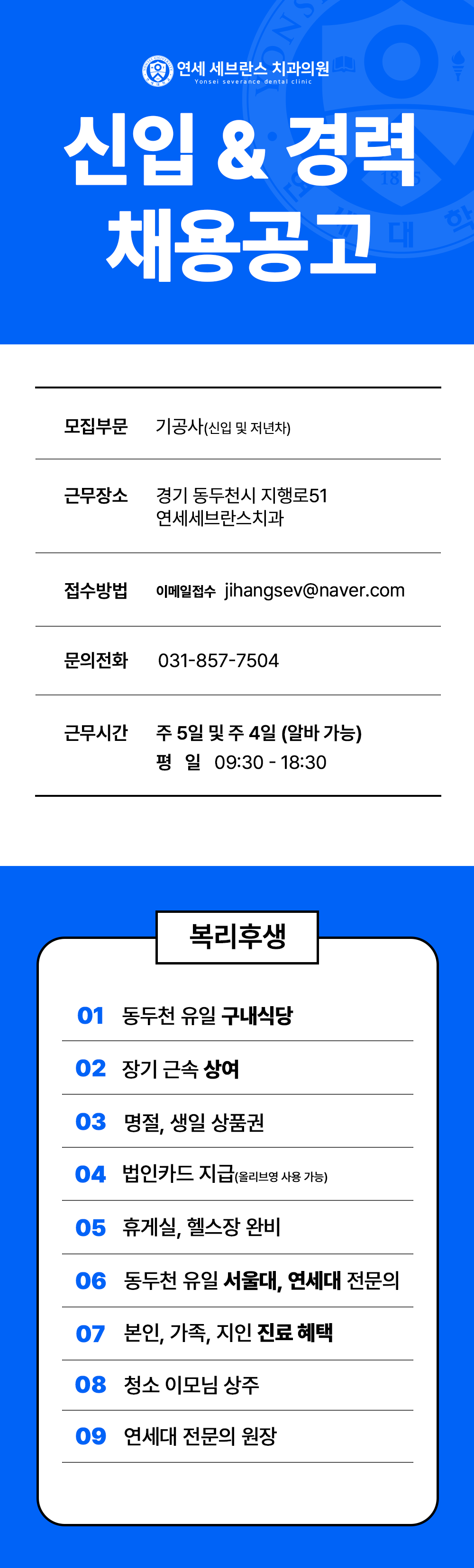 안녕하세요. 동두천 연세세브란스치과에서 기공사 선생님 모집합니다.