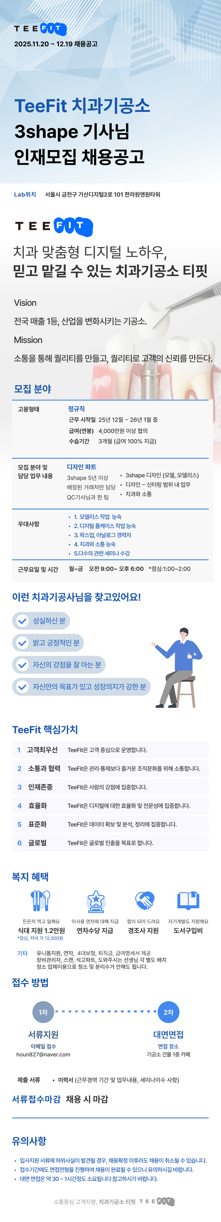 각 팀별 업무량을 분배하기 위해 3shape 기사님 구인합니다.